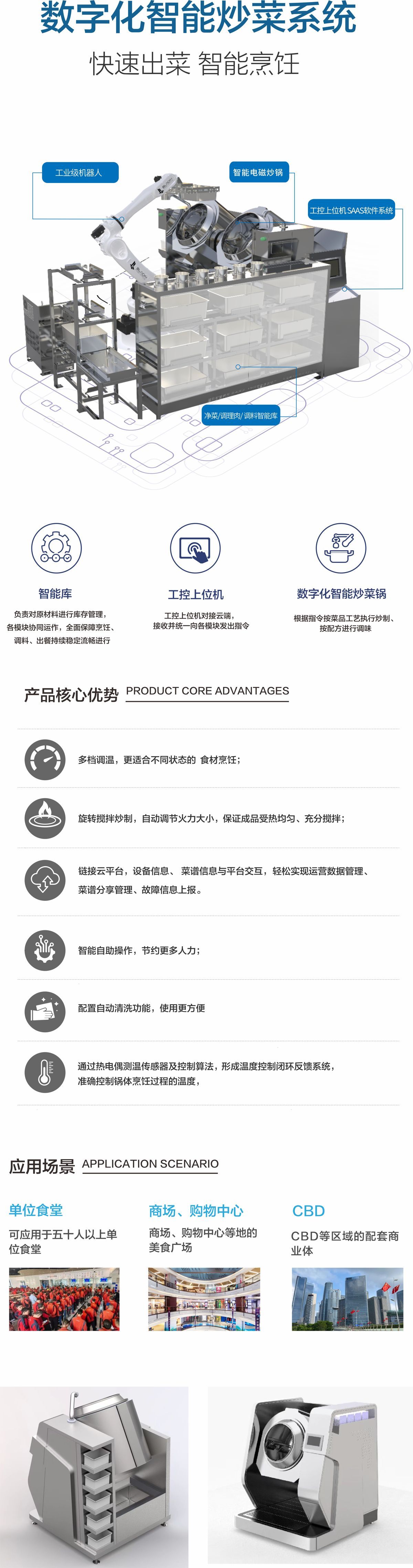 可用于集體用餐的食堂(機關(guān)、院校、工廠、中央廚房配餐中心等大型食堂)等場景量身打造的烹飪系統(tǒng),主要由空盆/成品智能庫、凈菜/調(diào)理肉/調(diào)料智能庫、工控上位機SaaS軟件系統(tǒng)、數(shù)字化智能炒菜鍋以及工業(yè)級機器人組成,工控上位機對接云端,接收并統(tǒng)一向各模塊發(fā)出指令。